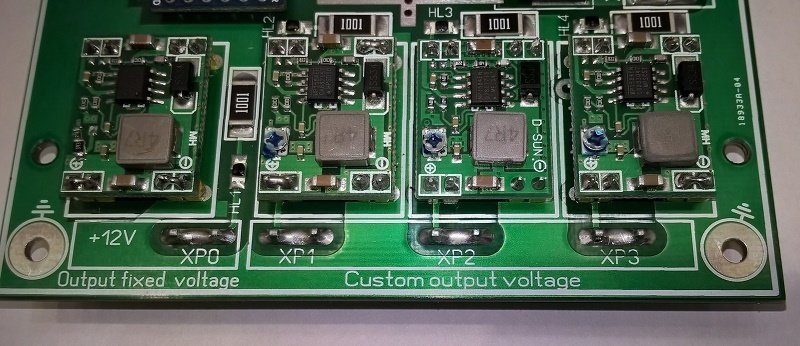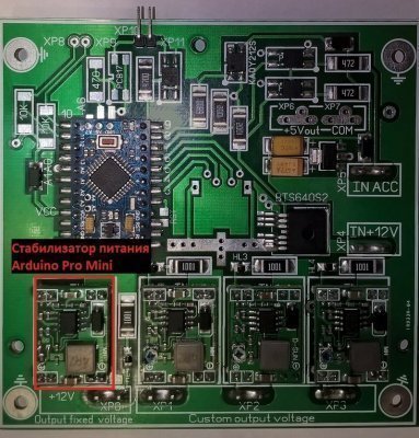 Решил сделать распределитель питания для подключения периферии (планшет, регистратор, зарядка для телефона…)в автомобиль. Его возможности: четыре независимых канала питания, три из которых настраиваемые в диапазоне от 0 до 14В с током нагрузки до 2,5 А. Использую проверенные в работе, почти не убиваемые DC-DC преобразователи на базе MP1584. yandex.ru/images/search?text=MP1584 Еще один канал построен на преобразователе NSD15-12S5 с гальванической развязкой земли и фиксированным напряжением +/-5 вольт и током до 3 А (Модуль NSD15-12S5 не является обязательным и необходимым элементом системы. В варианте распределителя питания без NSD15-12S5 напряжение канала равно напряжению на АКБ с настраиваемыми временными задержками вкл./выкл.) www.mean-well.ru/store/NS…yclid=6429783111707921543 Один слаботочный канал для управления планшетом по датчику Холла ( возможен как с нормально замкнутым выходом, так и с нормально разомкнутым). Управление каналами построено на базе контроллера Arduino Pro Mini и смарт-ключе коммутации напряжения BTS724G от компании Infineon. www.infineon.com/dgdl/Inf…316f112290116f299e245725c В свою очередь вся эта система подключена к бортовому напряжению питания автомобиля через еще один смарт-ключ BTS640S2 от той же компании. Немного о смарт-ключах. Это устройства коммутации напряжения с высокими токами (до 200 А), заменяющие собой мощные реле, предохранители и имеющие в своем арсенале такие параметры, как защита от короткого замыкания, от переплюсовки напряжения, защита от обратного тока, перегрева, возможность контролировать изменения в нагрузке. Вернусь к распределителю… Подключается он к бортовой сети авто напрямую без кнопок и включателей в месте, где напряжение постоянное и не пропадает ни при каких обстоятельствах (скажем непосредственно к аккумулятору). Еще один вывод подключен к линии "АСС". Алгоритм работы следующий (может быть изменен по желанию): Один из вариантов алгоритма работы распределителя питания (для питания планшета, USB HUB-а, периферии). DC-DC модуль NSD15-12S5 в данном исполнении не используется и контакты"IN +12V", "IN ACC", ХР0, ХР1, ХР2, ХР3 выведены на противоположную сторону от радиатора.Контакты на плате распределителя:Выход ХР0 — напряжение не регулируетсяи всегда такое, как и на аккумуляторе. Выход ХР1 — напряжение на выходе 5,5 В. (USB HUB)Выход ХР2 — напряжение на выходе 4,2 В. (питание планшета)Выход ХР3 — напряжение на выходе 5,5 В. (периферия)Выход ХР11 — слаботочный выход нормально замкнутый на "землю"(при включении канала на выходе пропадает "GND-земля")Для управления по датчику Холла или чем-то подобным.Алгоритм работы.Включаем "АСС":Через 4 сек. включаются каналы Выход ХР1, Выход ХР2, Выход ХР3.Еще через 2 сек. включаются каналы Выход ХР0,Выход ХР11.Выключаем "АСС":Через 6 сек. выключаются каналы Выход ХР3, Выход ХР11.Еще через 2 сек. выключается канал Выход ХР0.Канал Выход ХР2 выключится через 30 часов или если напряжение на АКБ станет меньше или ровно 11,9 В.Если включен "АСС", но не заведен двигатель и напряжение на АКБ уменьшилось до 11,9 В :через 6 сек. выключаются каналы Выход ХР3, Выход ХР11.Еще через 2 сек. выключается канал Выход ХР0.Еще через 10 секунд выключится канал Выход ХР2.Питание на контроллер (Arduino ProMini) будет подаваться до поворота ключа из положения "АСС" в положение "OFF".Запуск системы возможен только если напряжение на АКБ больше или ровно 12,0 В. Размер платы распределителя 98 мм. х 96 мм. Монтаж выполнен на двухсторонне