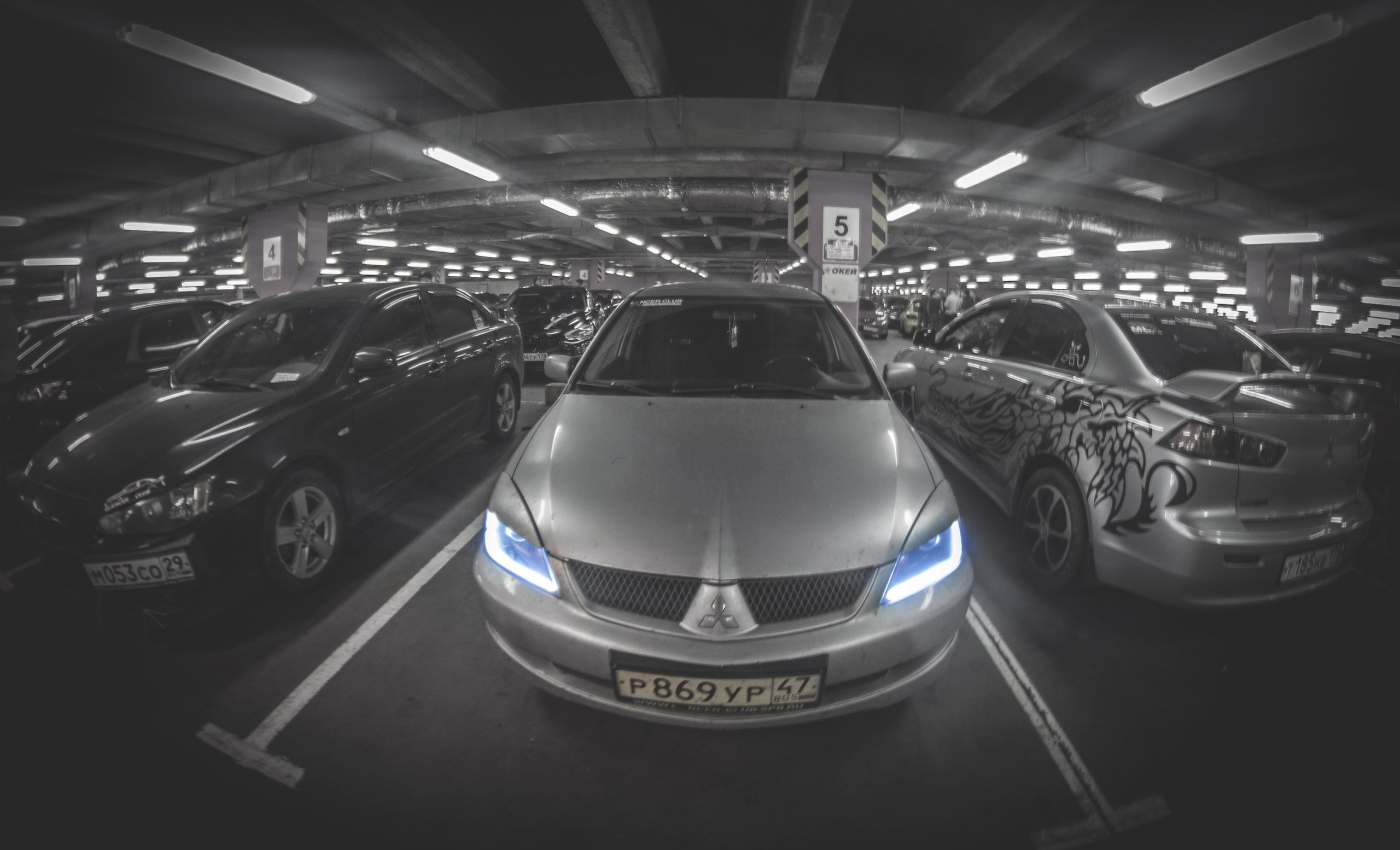 серебристый лансер 9, 2,0, МКПП, гос.номер Р869ур47, наклейка на заднем стекле
