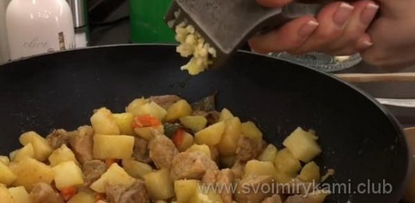1. Вы приготовьте для жены сюрприз : жаркое со свининой и картошкой в мультиварке. Список ингредиентов свинина (ошеек) – 800 грамм; картофель – 8-9 штук; лук –2 штуки; морковь – 1 штука; перец сладкий – 1 штука; чеснок – 3 зубка; подсолнечное масло – 3 столовые ложки; соль, специи. Морковь нарезаем соломкой, лук –полукольцами. На мультиварке включаем программу «Жарка» и добавляем подсолнечное масло. Выкладываем в емкость мультиварки овощи и готовим 5 минут. Мясо промываем, просушиваем и нарезаем кусочками 3 см. Добавляем мясо к овощам и обжариваем до 10 минут. Сладкий перец нарезаем соломкой, чеснок – мелкими кубиками. Добавляем к мясу. Картофель нарезаем кубиками 3 см. Отправляем к мясу. Добавляем специи, соль и накрываем крышкой. Включаем на мультиварке программу «Тушить» на 1 час.