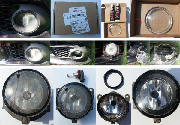 Откручиваем один саморез на корпусе. Аккуратно снимаем, не ломая защелки. Откручиваем три самореза, которыми ПТФ крепится к бамперу. Нижний не трогаем, он регулировочный. Отстегиваем шлейф. Вытаскиваем лампочку. Далее аккуратно по кусочкам выковыриваем стекло, с помощию ножа и плоской отвертки очищаем всё от старого герметика. Нужно вытащить и очистить также пластмассовую проставку. Всё обезжириваем. Протираем до блеска отражатель. Ставим проставку на место и заполняем герметиком. Ждем 5 минут. Ставим стекло, прижимаем и фиксируем малярным скотчем или изолентой. Ждем два часа и собираем в обратном порядке. При необходимости регулируем направление светового пучка.