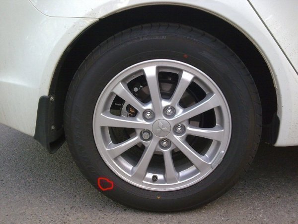 Добрый день. В Галант-авто на Коломяском 2 месяца назад покупался Lancer X. Сегодня обнаружил, что на левой стороне авто косяк с направлением вращения колес: колеса крутятся в сторону противопожную стрелке. Как будто бортировалось все для правой стороны. София, как могло такое случиться, что при предпродажной подготовке не исправили этот косяк? Это даже если предположить, что накосячили на заводе... Как будем исправлять? Ну, затяжку болтов колес я догадался сразу проверить, но направление вращения колес как-то не бросилось в глаза, только сейчас заметил. Странно, почему машина после 180 плохо держит дорогу?... Странно, почему клиенты хотят присутствовать при ТО непосредственно около мастера?... Прикрепил 4 файла фоток всех колес, стрелка выделена красным.