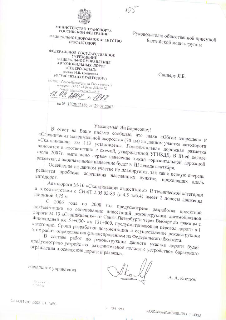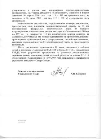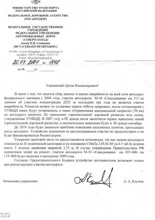 темыч Опубликовано 1 августа, 2007 Автор Опубликовано 1 августа, 2007 (изменено) Сообщаю,что получил официальные ответы от Севзауправавтодор и Управления ГИБДД по СПБ и ЛО Ответы прикладываю в приложениях. По ответу Росавтодора Создалось впечатление ,что чиновники несколько заблуждаются касаемо знаков ОБГОН ЗАпрещен (поскольку в ответе ГИБДД четко сказано ,что были разработаны предложения по установке дорожных знаков 16 июля и направлены в Росавтодор) Вообщем налицо несогласованность работы двух ведомств . Знак Ограничения скорости 70 км отсутствует (хотя в ответе Росавтодора содержится иная информация) На ближайших выходных сделаю фотографии установки знаков на месте их действия . Касаемо расширения дороги ,ответ Росавтодора мягко говоря не корректен ,поскольку дорога хоть относится ко 2 технической категории ,но на самом деле при существующем грузопотоке должна относиться к категории 1-Б(ответ ГИБДД) ссылка на СНИП расположена тут: http://www.v-stroim.ru/docs1236.html Нашел много интересного например: пункт 5.2 : Примечание. На дорогах I-б и II категорий при соответствующем технико-экономическом обосновании допускается устройство примыканий дорог III категории в одном уровне ( при обязательном отгоне левоповоротных направлений движения ). То есть получается ,что дорога спроектирована с ошибками -цена которых человеческие жизни. Касаемо ответа ГИБДД: -есть однозначное понимание ,что дорога по грузопотоку должна относиться к категории 1б-4 полосы движения +разделительная полоса -Касаемо статистики -указано только 2 случая ,которые имели погибших Случаи столкновений ,в которых пострадали только машины в статистику не идут Кстати по поводу статистики по ДТП можно почитать тут: http://www.gibddspb.ru/news/dtp/?filtr=act...999&page=21 Структура сайта не позволяет сделать быструю выборку по интересующему перекрестку ,но я постараюсь найти время ,чтобы всю статистику просмотреть и найти интересующий перекресток. -касаемо дежурства сотрудников ГИБДД По этому вопросу собираюсь завтра побеседовать с начальником 10 отдела ГИБДД тов. Кузнецовым А. Хочу заметить ,что экипажи ДПС не дежурят на перекрестке(за 4 года видел машину ДПС только на ДТП) Кстати ,почему не дежурят уже обсуждалось в этой теме. Собираюсь в ближайшее время: -направить свое несогласие в Росавтодор и ГИБДД по полученным ответам. -Найти адрес и контактное лицо руководителя ФЕДЕРАЛЬНОЙ ЦЕЛЕВОЙ ПРОГРАММЫ "ПОВЫШЕНИЕ БЕЗОПАСНОСТИ ДОРОЖНОГО ДВИЖЕНИЯ 2006 - 2012 ГОДАХ" http://www.businesspravo.ru/Docum/DocumSho...nt__Page_1.html Исходя из постановления создано целое УЧРЕЖДЕНИЕ,относящиеся к МВД Буду искать контакты (если кто чего найдет дайте знать) -Направить в Росавтодор ,ГИБДД пожелание о необходимости выслать ходатайство руководителю данной программы о принятии необходимых мер на данном перекрестке . -отправить письма в правительство Ленинградской области и правительство Санкт-Петербурга с просьбой подписать ходатайство о включении данного перекрестка в Целевую программу -отправить письма в Филиал в СПБ партии Единая Россия и в приемную Балтийской Медиа Группы Из общения с Росавтодором узнал,что за 113 км со стороны СПБ отвечает Рощинское ДРСУ ,а со стороны Выборга отвечает Выборгское ДРСУ ,вообщем перекресток находится на стыке ответсвенности двух подразделений Росавтодора. P.S.Из общения с ГИБДД узнал ,что в их адрес поступило уже нескол